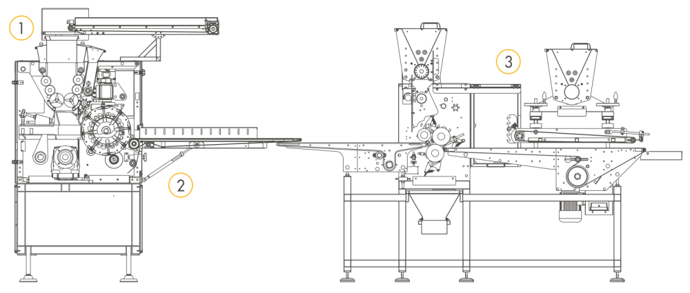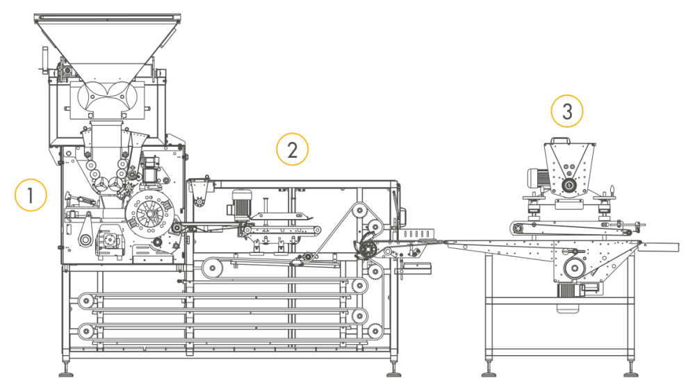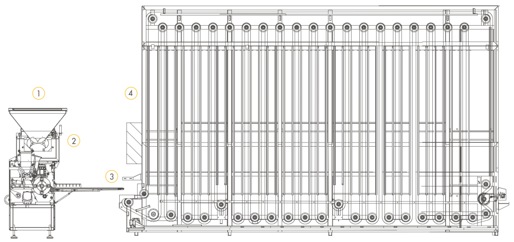 | I-4 | До 15.000 шт/ч* в зависимости от продукта/г | Тесто загружается в бункер TR-SP который автоматически подаёт тесто в автоматический тестоделитель со встроенной камерой предварительной расстойки SVIC. Затем округлённые заготовки из тестоделителя-округлителя поступают на формовочную станцию DTM которая формует заготовки в нужные форматы хлеба. | 1. TR-SP 2. SVIC 3. DTM |