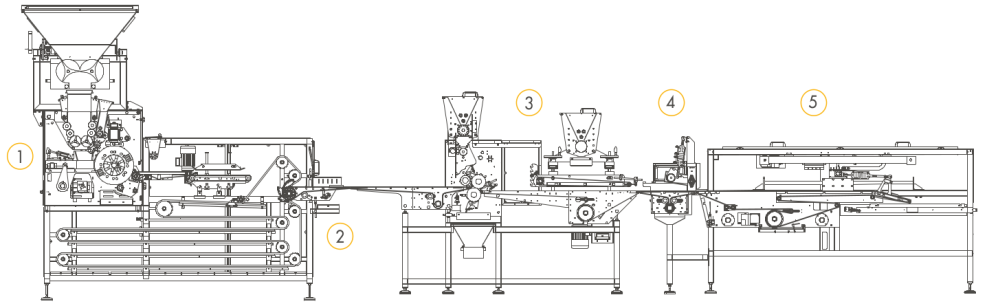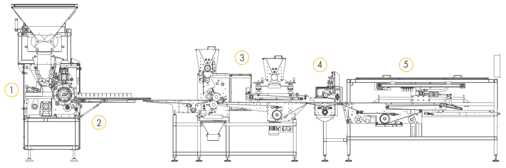 | I-5 | До 15.000 шт/ч* в зависимости от продукта/г | Тесто загружается в бункер TR-SP который автоматически подаёт тесто в автоматический тестоделитель со встроенной камерой предварительной расстойки SVIC. Затем округлённые заготовки из тестоделителя-округлителя поступают на формовочную станцию DTM, которая формует заготовки в нужные форматы хлеба. Затем продукты выравниваются с помощью системы выравнивания ALL и автоматически укладываются на противни через отрывной конвейер TPS. | 1. TR-SP 2. SVIC 3. DTM 4. ALL 5. TPS |