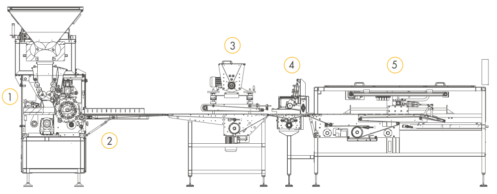 | I-3 | До 15.000 шт/ч* в зависимости от продукта/г | Тесто загружается в приёмный бункер TR-SP который автоматически подаёт тесто в автоматический тестоделитель SVI/SVI+. Затем округлённые заготовки из тестоделителя-округлителя поступают на формовочную станцию DTM, которая формует заготовки в нужные форматы хлеба. Затем продукты выравниваются с помощью системы выравнивания ALL и автоматически укладываются на противни через отрывной конвейер модели TPS. | 1. TR-SP 2. SVI/SVI+ 3. DTM 4. ALL 5. TPS |