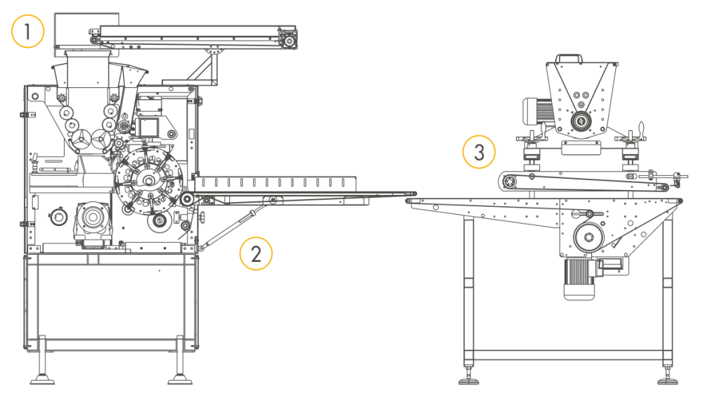 | I-6 | До 15.000 шт/ч* в зависимости от продукта/г | Тесто вручную загружается на подающий конвейер TPC который автоматически подаёт тесто в тестоделитель-округлитель SVI/SVI+. Затем округлённые заготовки из тестоделителя-округлителя поступают на промышленную формовочную станцию MDS-PRO которая формует заготовки в нужные форматы хлеба. | 1. TPC 2. SVI/SVI+ 3. MDS-PRO |