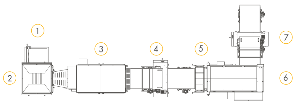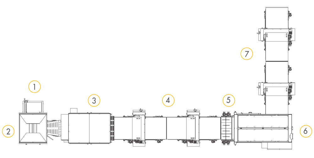 | I-7 | До 15.000 шт/ч* в зависимости от продукта/г | Тесто загружается в бункер TR-SP который автоматически подаёт тесто в тестоделитель-округлитель SVI/SVI+. Затем округлённые заготовки из тестоделителя-округлителя поступают на промышленную формовочную станцию MDS-PRO которая формует заготовки в нужные форматы хлеба. Затем продукты выравниваются с помощью системы выравнивания ALL и автоматически укладываются на противни через отрывной конвейер TPS. | 1. TR-SP 2. SVI/SVI+ 3. MDS-PRO 4. ALL 5. TPS |