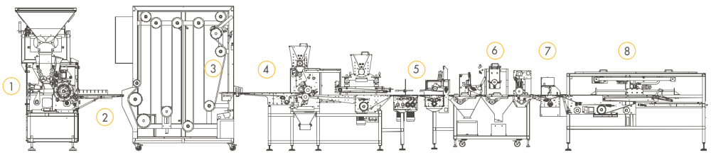 | I-8 | До 15.000 шт/ч* в зависимости от продукта/г | Тесто загружается в приёмный бункер TR-SP который автоматически подаёт тесто в тестоделитель-округлитель со встроенной камерой предварительной расстойки SVIC. Затем округлённые заготовки из тестоделителя-округлителя поступают на промышленную формовочную станцию MDS-PRO которая формует их в желаемые форматы хлеба. Затем продукты поступают на моторизованный транспортёрный конвейер для укладки TP который позволяет оператору перемещать продукты. | 1. TR-SP 2. SVIC 3. MDS-PRO 4. TP |